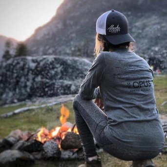 A light grey long sleeve crew shirt with the Alaska Luxury Tour logo on the front left and our famous Opus boat on the back.