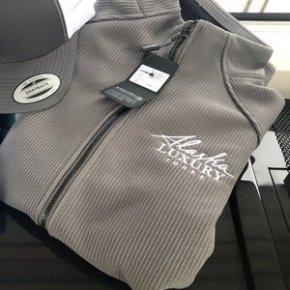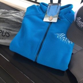 A grey and blue corduroy zip-up jacket with the Alaska Luxury Tour logo on the front left.